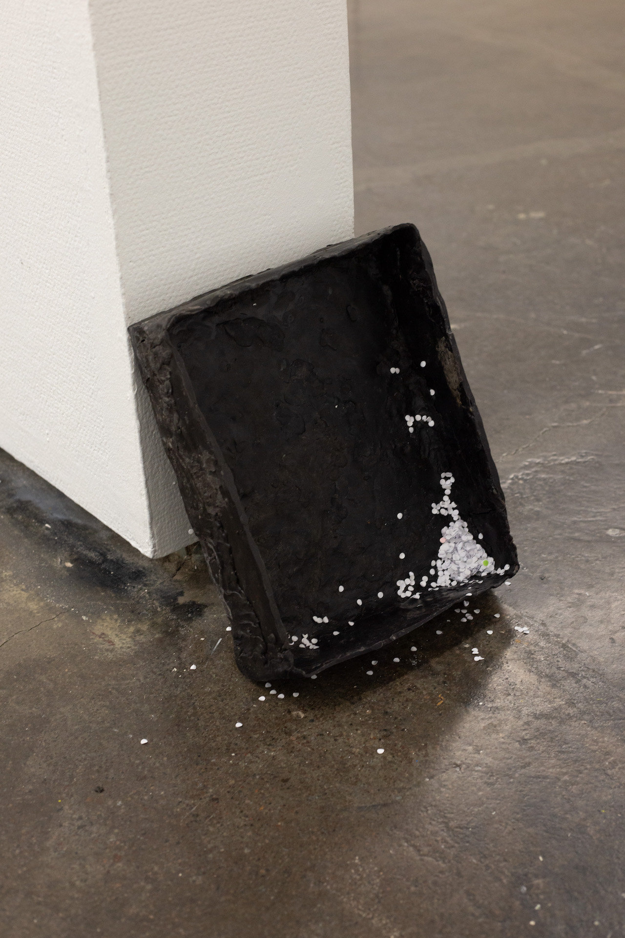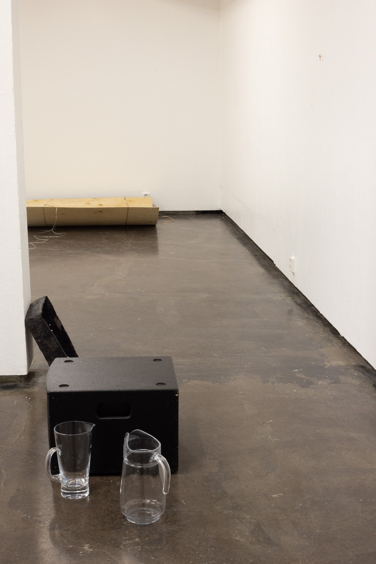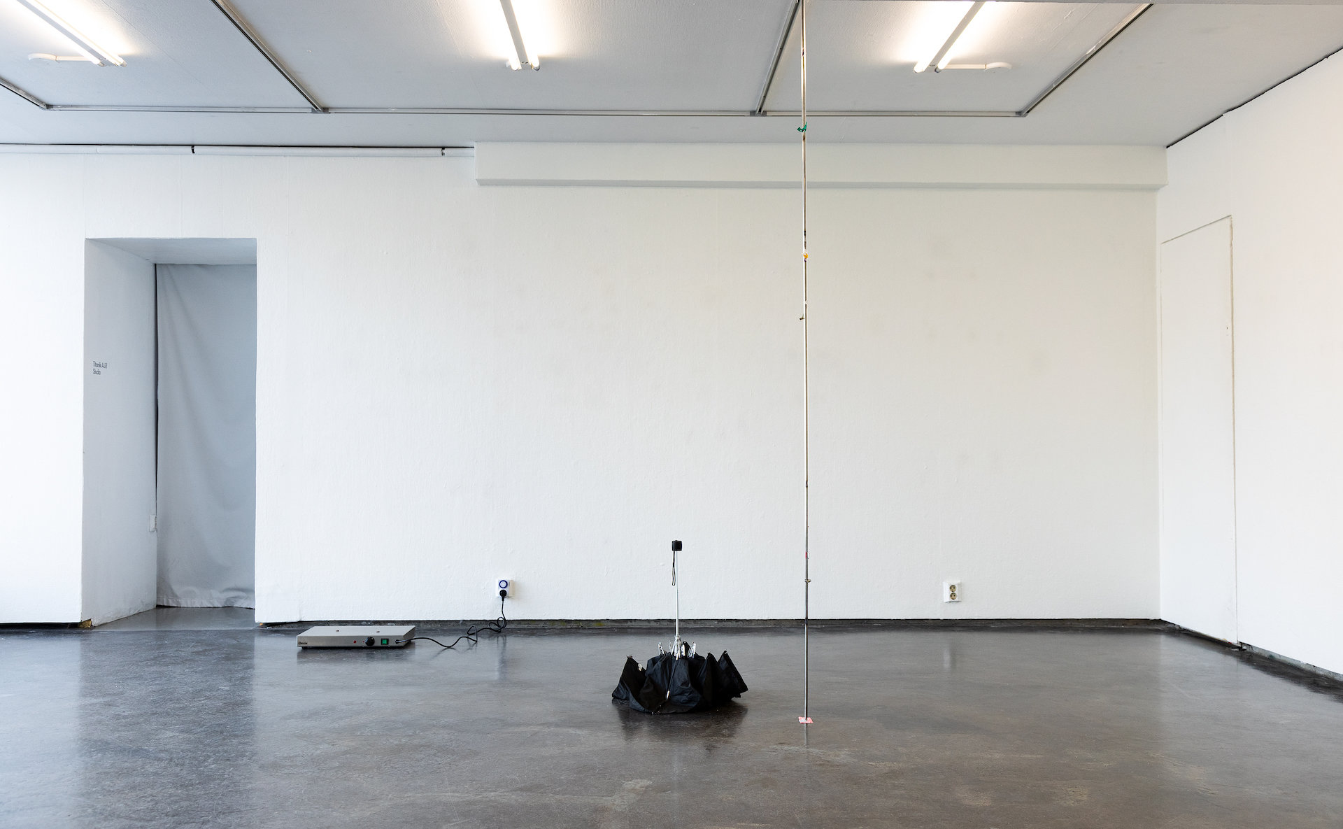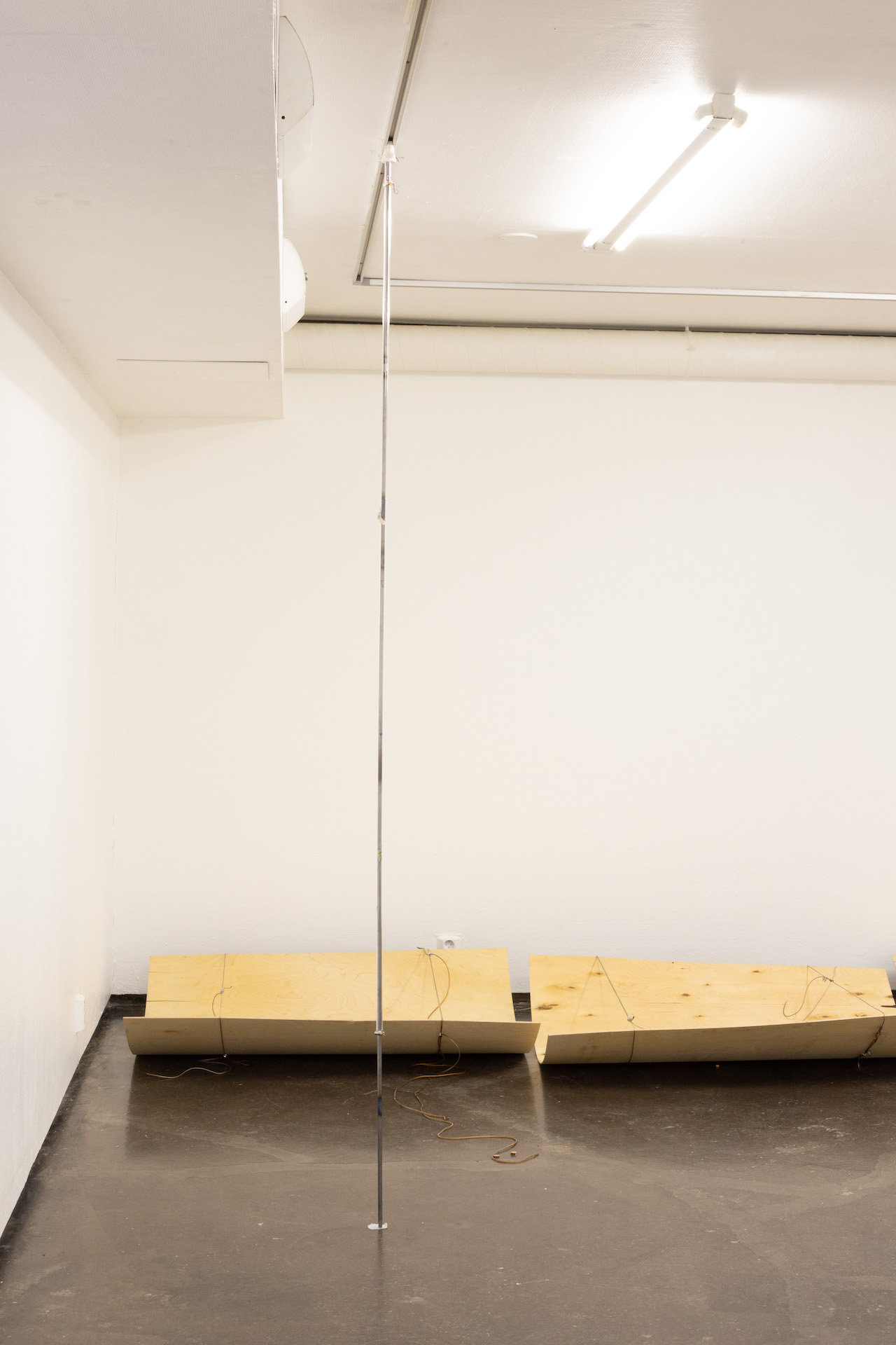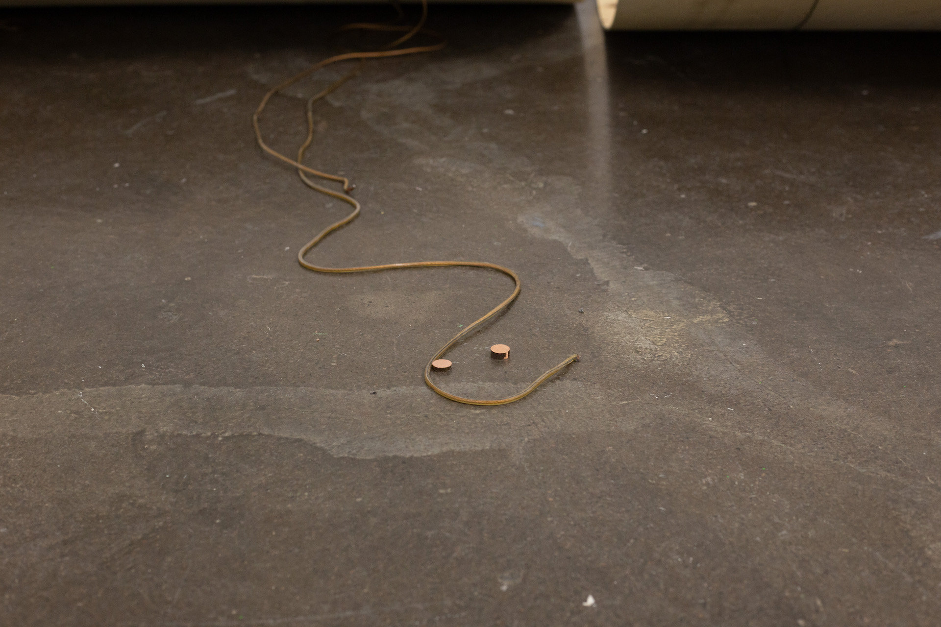 The exhibition is a composition of arrivals into the space, consuming the place, passing through it, settling into it, and working through the points of contact, sensations, and experiences accumulated from these with materials, things and objects, resulting in a wavering whole or a fold—layered upon itself in a constant state of becoming.